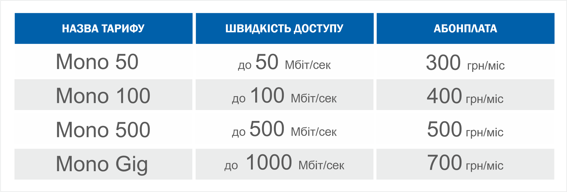 - PON 30 (швидкість до 30Мбіт/сек) АВТОМАТИЧНО переводяться на тарифний план Mono 50 (зі швидкістю до 50Мбіт/сек).
