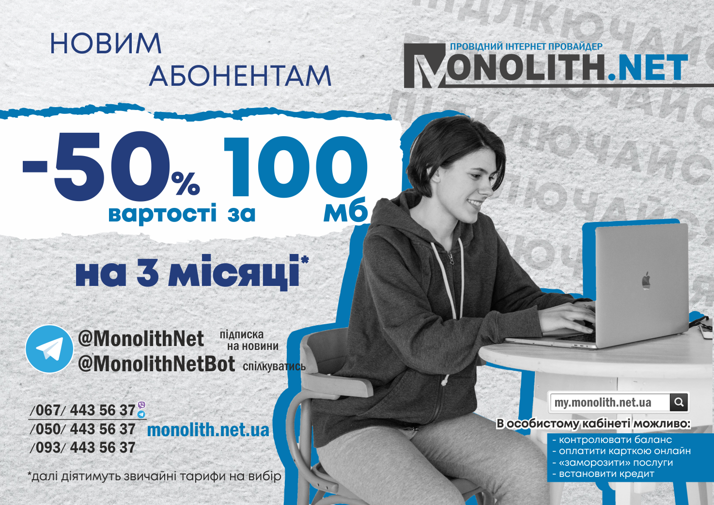 Підключайтесь до мережі Моноліт.Нет та отримуйте -50% знижки на тариф 100 мб на 3 місяці.